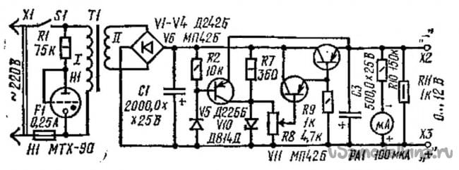 Блок питания обеспечивает регулируемое стабилизированное напряжение 0,5…12 В с максимальным током 400 мА. Элементная база устройства – сугубо дискретные элементы, германиевые транзисторы старых серий. При определении со схемотехникой блока, все элементы мгновенно и без труда нашлись в коробках и банках, параметры тоже устроили. Решено было не противиться воле провидения.