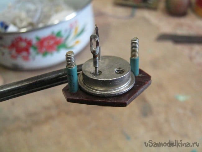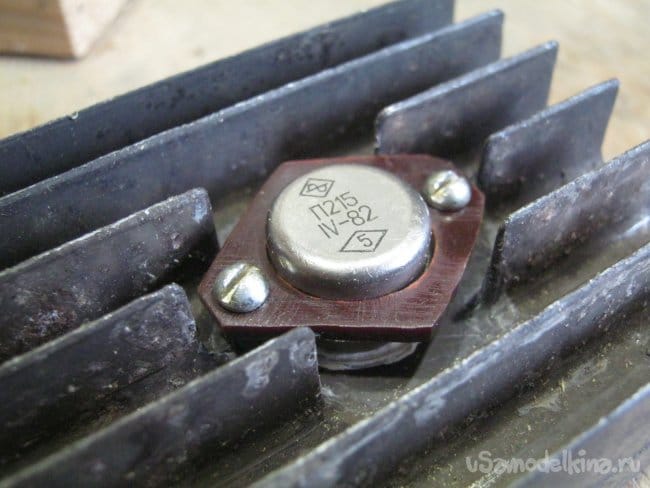 В транзисторе П213 металлический, прижимаемый к радиатору корпус соединен с выводом его коллектора – чтобы не изолировать от металлической коробки блока весь радиатор, изолировать пришлось сам транзистор. К счастью, нашлась специальная слюдяная прокладка, к несчастью, не оказалось специальных винтиков с изоляторами, пришлось выкручиваться. Момент удалось разрешить фланцем-изолятором. Выпилил его из нетолстого текстолита ювелирным лобзиком с крупнозубой (№0) пилкой. Как и при использовании всех слоистых пластиков, детали из текстолита следует красить (лакировать) – они весьма пористы и как следствие, гигроскопичны.
