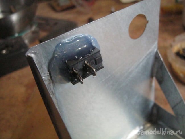 Некоторые установочные элементы были не рассчитаны на установку в столь тонкую (0,5 мм) панель, пришлось укрепить их термоклеем. Его адгезия к стали здесь неважна, он работает этаким упором на сжатие. Пластиковые части предварительно покорябал острым ножом.