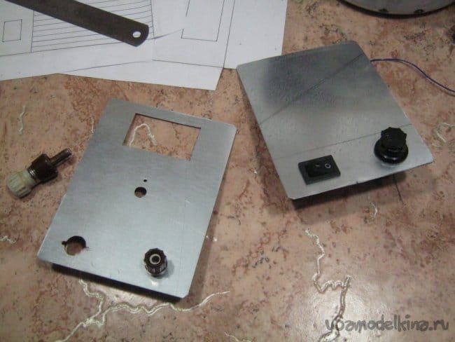 Разметку торцевых панелей делал на манер накернивания печатных плат – распечатал вычерченный в КАДе эскиз в формате 1:1, вырезал ему лепестки, обернул вокруг заготовки железки и закрепил (при необходимости) липкой лентой. Разметку прямоугольных проемов перенес слегка накернив их углы, круглых – их центры. Чертилкой или тонко отточенным карандашиком соединил прямоугольники, в центры ставил ножку циркуля-балеринки (для малых окружностей). Дополнительные загогулины вырисовывал по месту, примеряя к детали.