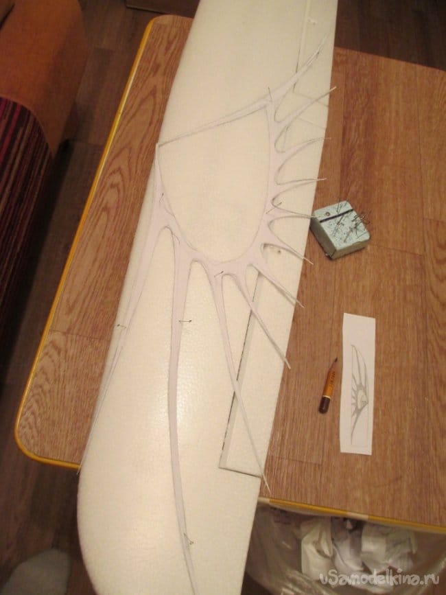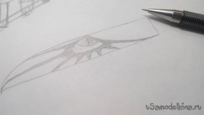 ДА....Чего то отвлекся, в этом проекте решил биомеханическую картинку заделать. Небольшой эскизик на бумажке, затем увеличил, вырезал разметочный трафарет. Тонковат и жидок получился пришлось на крыле закреплять иголками. Ага, пропустил, конечно протер спиртом все места нанесения рисунка. Обвел мягким карандашиком.
