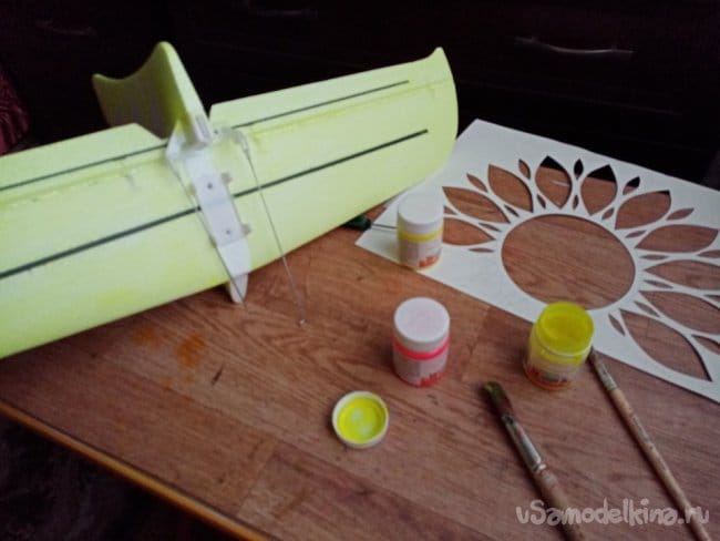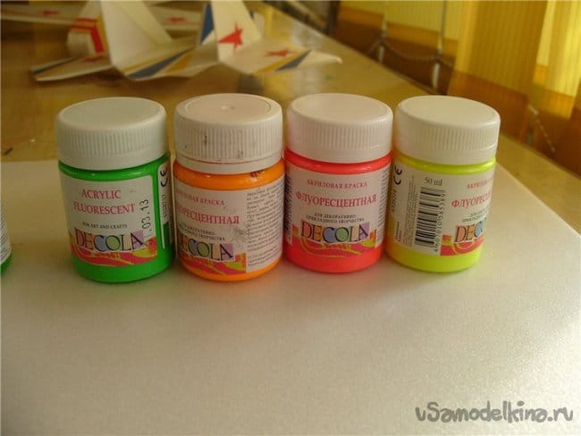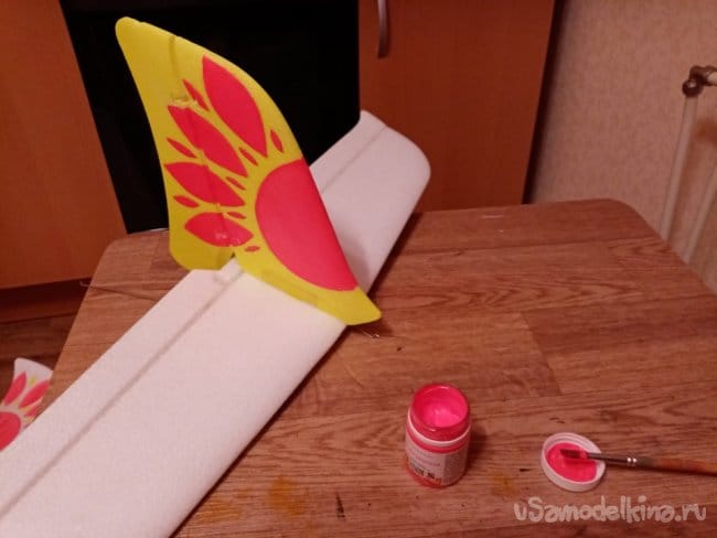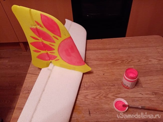 Начинаю с самого светлого, желтая. Как не странно, но первый слой нужно наносить слегка разбавленной краской, и потщательнее прокрашивать поле рисунка. она проникает в мелкие неровности и трещинки, которых на пенопласте достаточно много. После высыхания второй слой хорошо закрепляется на поверхности. Флуоресцентная краска имеет небольшую укрывистость, то есть не закрывает поверхность пастозно, типа наглухо. Поэтому нужно наносить достаточно много слоев малость разбавленной краски по разным направлениям. Если мазать толстым слоем, будут видны следы от кисти. в варианте покраски аэрографом проблем с этой краской еще больше.