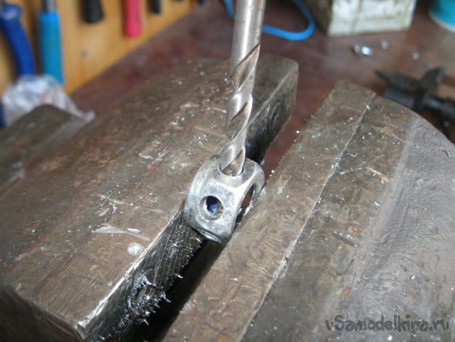 Керним и сверлим отверстия в гайке М24: три в соседних гранях и одно – в противоположной среднему. Можно не сразу брать сверло конечного размера, а начать, например, с 4 мм: я так всегда делаю.
