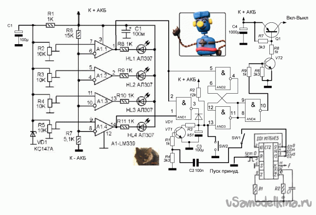 Блок управления БУ состоит из двух узлов, собранных на одной плате. Первый - узел анализа состояния АКБ. Пардон за некоторую неаккуратность при рисовании схемы, у других авторов бывает еще страшнее. Анализ напряжения на АКБ производится счетверным компаратором LM339 по типовой схеме, даже перерисовывать не пришлось. Крайние уровни управляют триггером «Вкл.-Выкл.», построенном на К561ЛА7, средние используются чисто для информации об уровне заряженности АКБ. Между 3 и 13 ногами микросхемы была встроена цепочка, позволяющая принудительно переключать триггер и, соответственно, включать ГЕН либо кнопкой «Пуск», либо от часовой микросхемы ИЕ12 без кварца, раз в сутки, «что бы не заржавел», однако потом от этой мысли отказались. Ключи построены по типовым схемам, имеется параллельный стабилизатор-ограничитель напряжения питания микросхем.