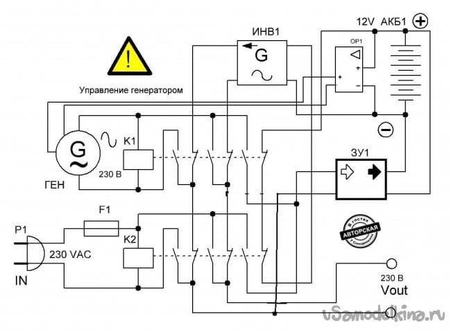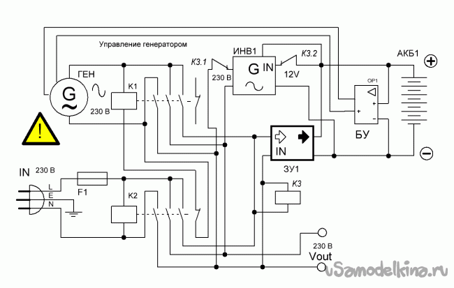 Здесь, на схеме, кроме упомянутых ранее элементов, присутствует еще блок управления БУ, который еще предстоит создать. Как же все это будет работать. При наличии напряжения 230 В в сети реле Р2 срабатывает и напряжение через НР контакты подается к потребителям и на ЗУ, при этом ИНВ отключен от АКБ контактами реле Р3. Это 1-й режим, основной. При отсутствии напряжения в сети через нормально замкнутые контакты Р1 и Р2 напряжение от ИНВ подается потребителю, состояние АКБ контролируется БУ – 3-й режим, экономичный. Если напряжение на АКБ из-за разрядки или большой нагрузки просаживается ниже установленного уровня, БУ дает команду на включение ГЕН, это 2-й режим. При этом Р3 отключает питание ИНВ, а контактами Р1 включается в работу ЗУ, для и до полной зарядки АКБ. А теперь изобразим полную схему, применяем два реле с группами 3 НЗ + 3 НР.