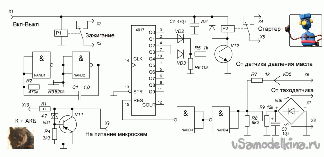 Второй узел - узел управления двигателем ГЕН. При подаче команды «Вкл.» реле Р1 включает зажигание, а Р2 – стартер. Схема на К561ЛА7 и К561ИЕ8 обеспечивает его включение на 3…10 сек., в зависимости от настройки R3. Если сразу не завелся – пауза на время 15…50 сек., после чего цикл повторяется. Когда двигатель завелся, контакты датчика давления масла дают "1" на вход R ИЕ8 и команду на отключение Р2 и, соответственно, стартера. Сигнал от таходатчика не пробовали, и так хорошо работает. Глушится двигатель выключением зажигания.