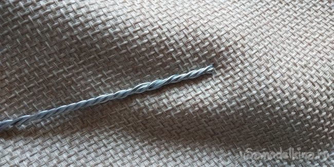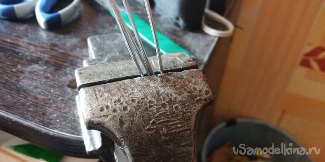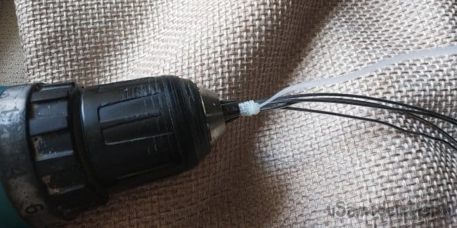 Теперь нужно зафиксировать проволочки одним концом в тисках, а другим – в шуруповерте. Нужно скрутить проволочки в один плотный трос.