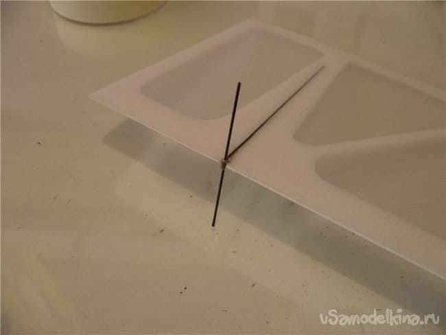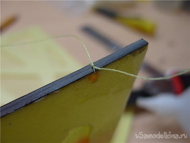 Когда все натянуто и ровно, закрепляю капелькой циакринового клея. Поскольку он разъедает потолочку, надеваю на кончик иголку и точность попадания капельки значительно повышается. Если клей застывает в иголке просто нагреваю её спичкой, клей выгорает и можно снова работать.