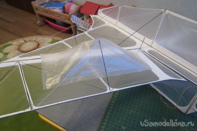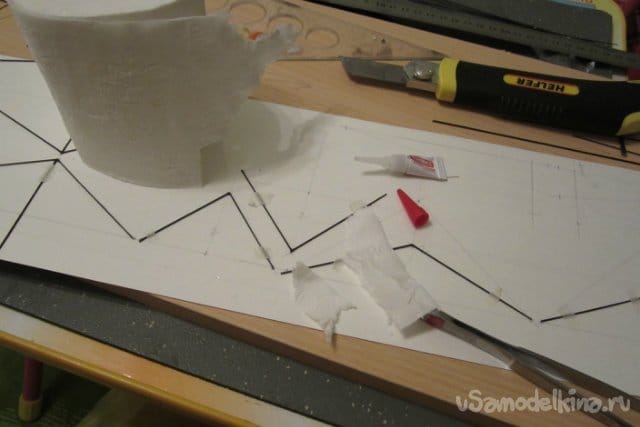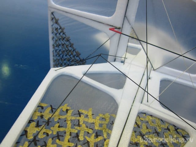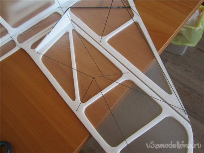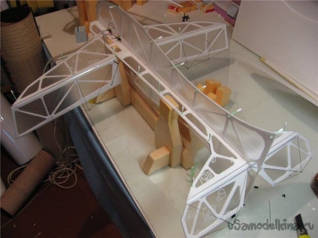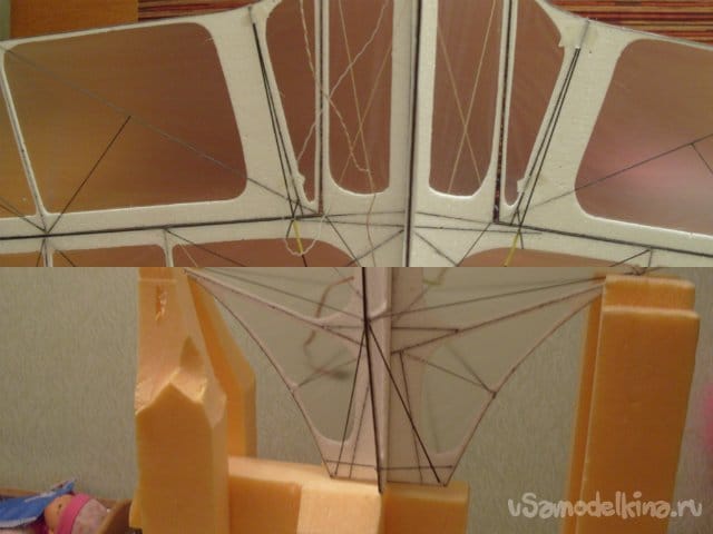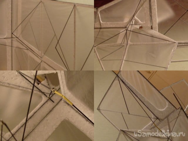 Частично использовал арамидные нитки. Для того чтобы они не прорезали пенопласт пропускаю из через трубочки от ушных палочек. Процесс проистекает следующим образом. Лохмачу трубочку шкуркой, чтобы повысить прочность склейки. Протыкаю шилом отверстие в которое вклеиваю титаном кончик трубочки и жду пока все высохнет.
