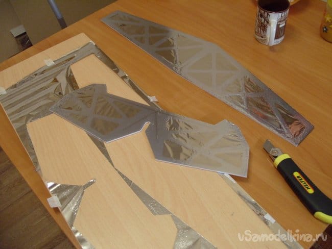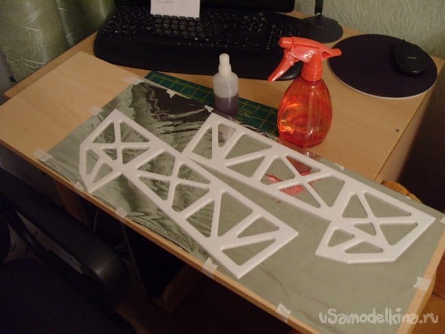 Раскладываю пленку на столе, слегка натягиваю, закрепляю скотчем. Затем распыляю клей на пенопласт, конечно-же на лестничной площадке. Выдержав по инструкции время аккуратно накладываю на пленку. Обрезаю по контуру, переворачиваю заготовку и проглаживаю по каркасу осторожно.