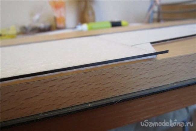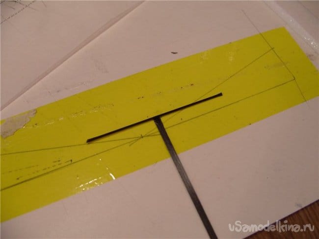 Особо напряженные места на каркасе оклеиваю тонкой карбоновой пластиной 05х3 мм. Но такое бревно слишком тяжелое, один метр весит целых 3 грамма! Поэтому расщепляю его по плоскости на две пластины. Для более точного исполнения изготовил из пластика и обломка канцелярского ножа несколько станочков. Без всяких регулировок под конкретный размер. Количество брака заметно снизилось.