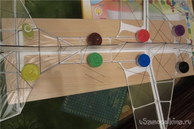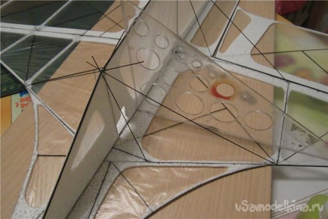 Для более четкого определения положения модели в воздухе нужно что-то накрасить. А краска увеличит вес. Попробовал окрасить спиртовыми фломастерами, по плоскости получается сильно похабно. Вот штрихами вполне себе хорошо.