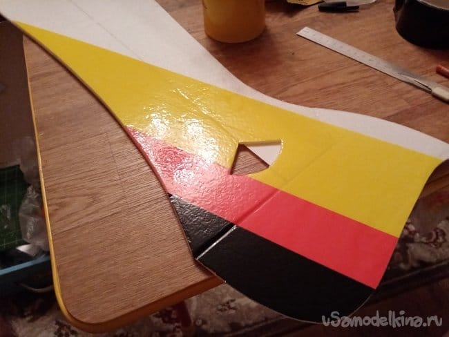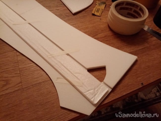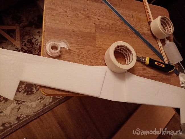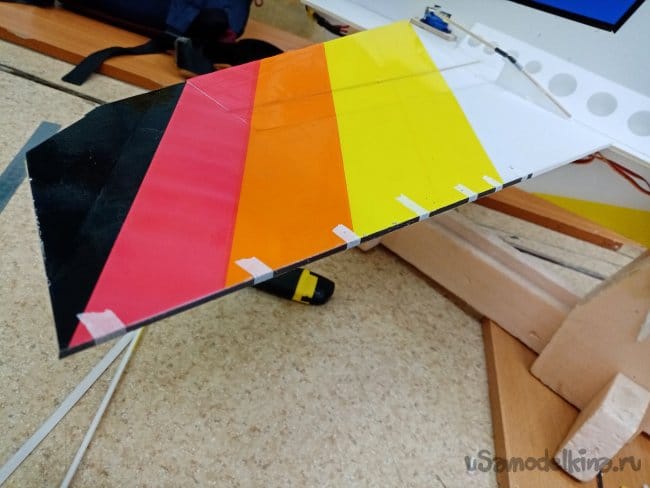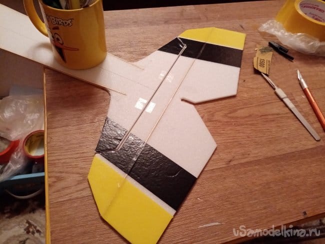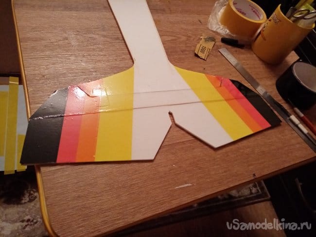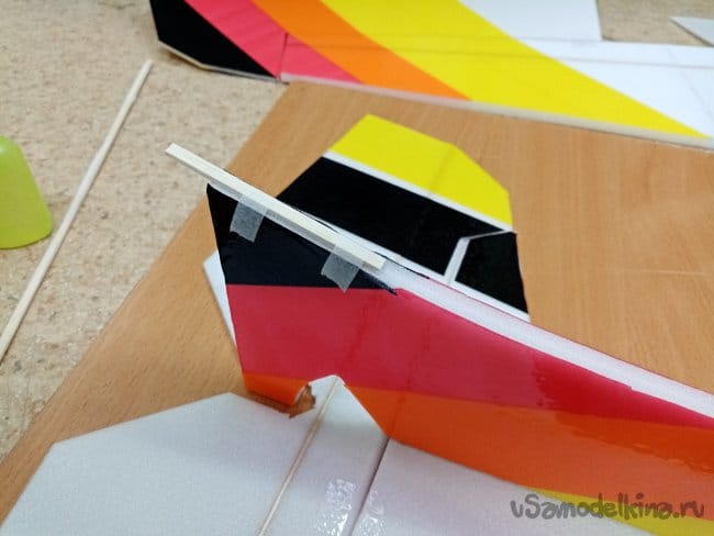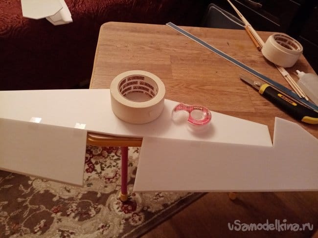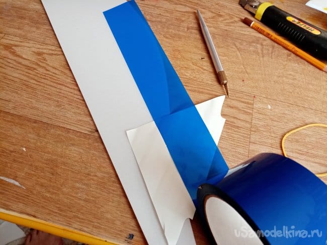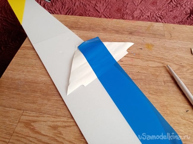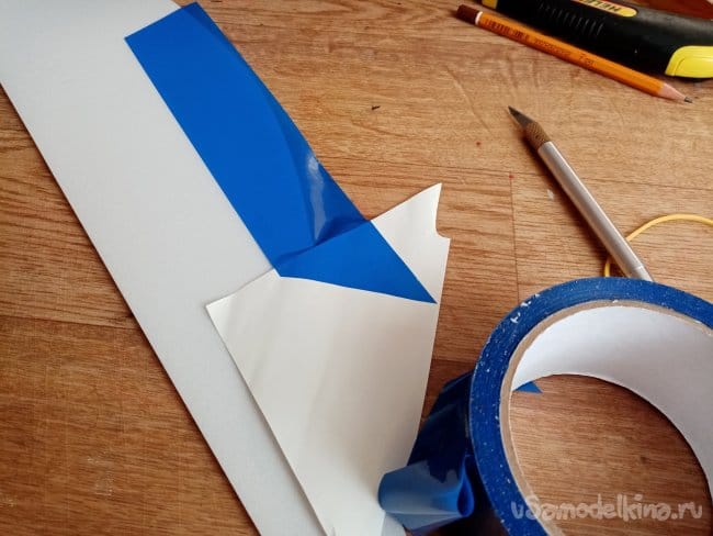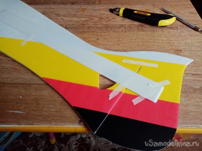 часть и рудер. А также-опять затык! Нижняя часть из двух слоев. Приклеиваю подкладки, чтобы плоскость для наклейки скотча была ровная.