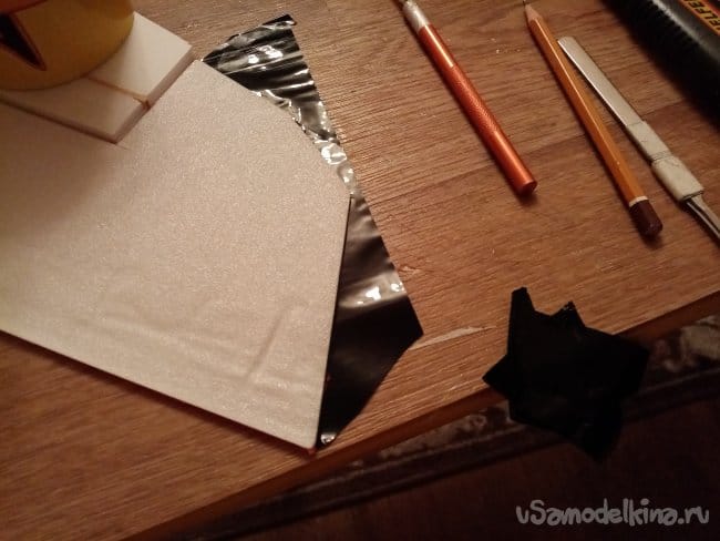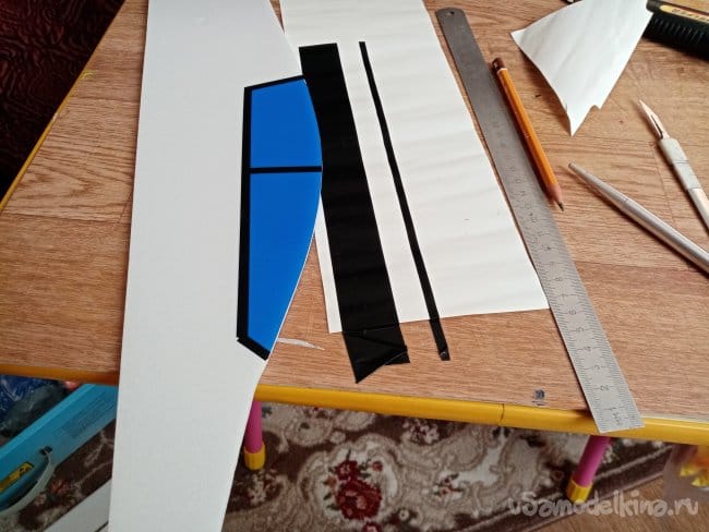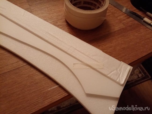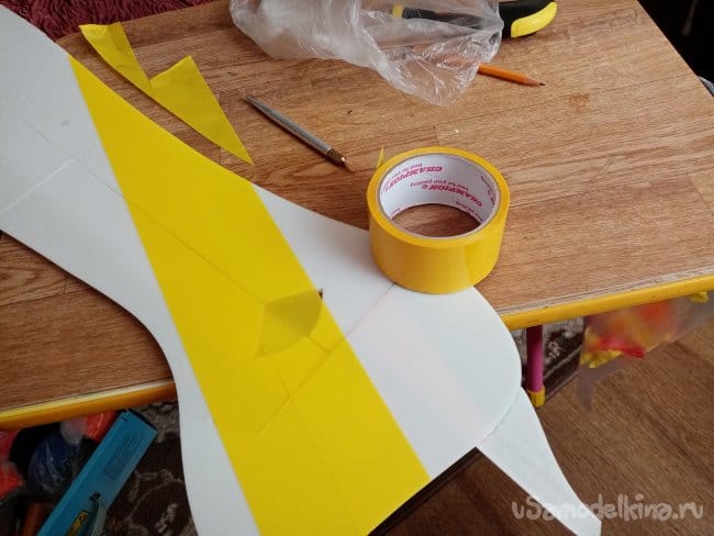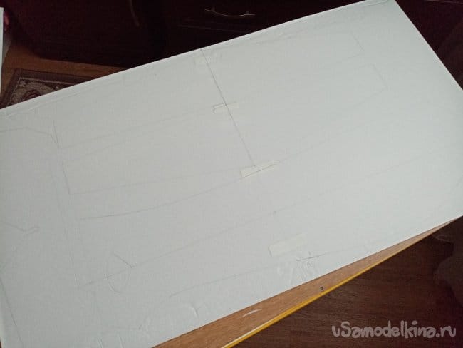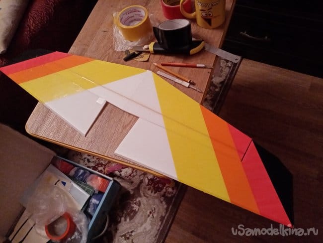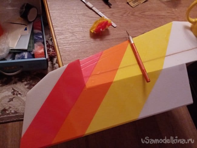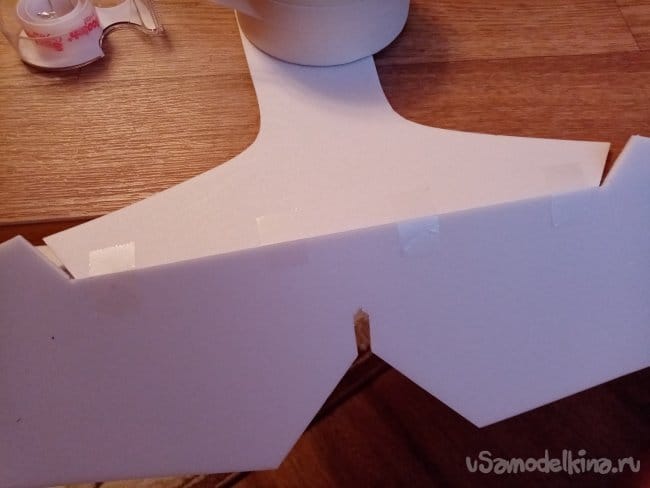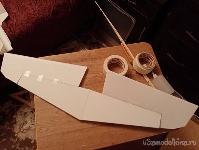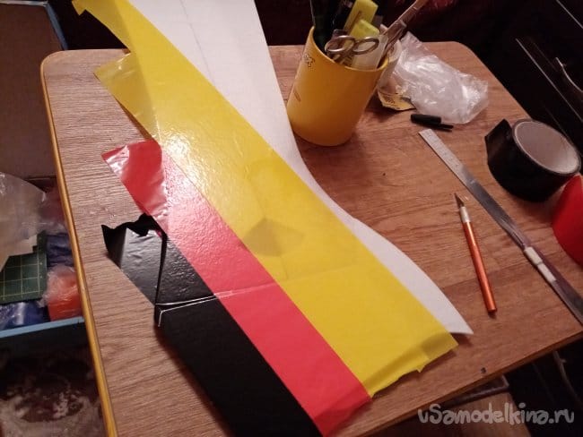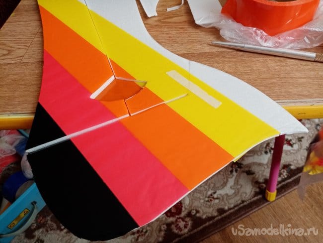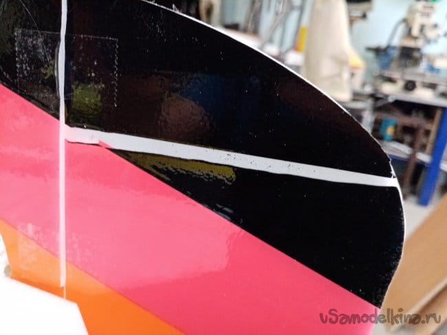 часть и рудер. А также-опять затык! Нижняя часть из двух слоев. Приклеиваю подкладки, чтобы плоскость для наклейки скотча была ровная.