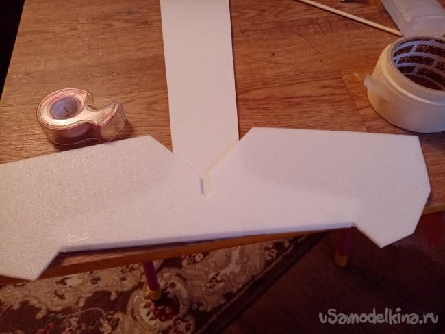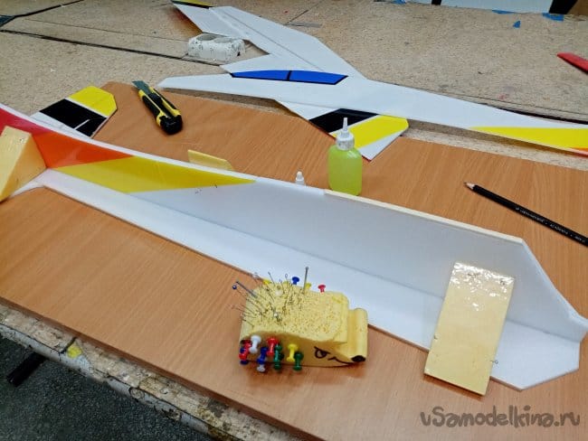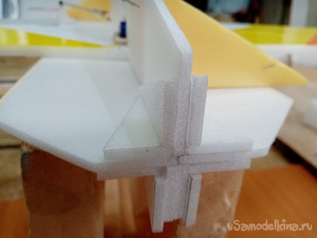 Начинаю сборку с нижней усиленной части фюзеляжа. Наношу клей на вертикальную часть и на размеченную полоску на горизонтальной. Соединяю детали, разъединяю, жду пять минут и наконец окончательно склеиваю. Вертикальность контролирую пенопластовыми треугольниками. Треугольники оклеены прозрачным скотчем, для защиты от клея. Всю конструкцию фиксирую иголками из ёжика. При прокалывании пенопласта стараюсь не попасть в клей. Инче после экстракции иголок можно вырвать кусок пенопласта вместе с клеем.