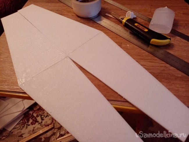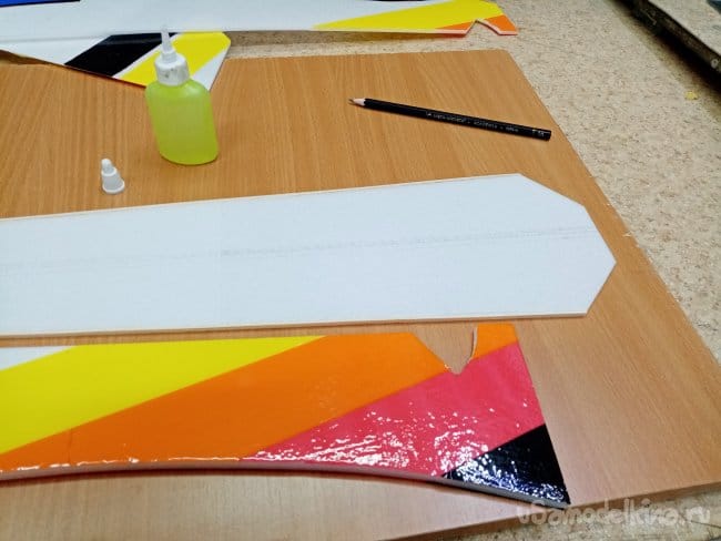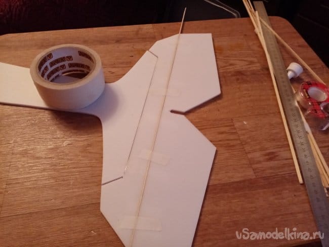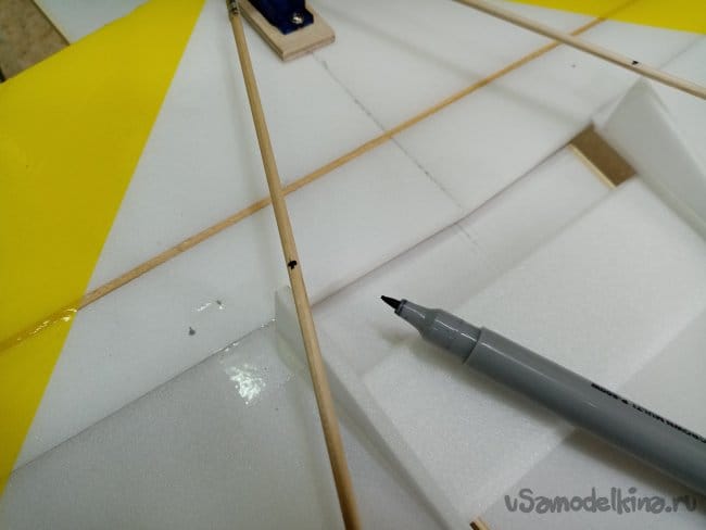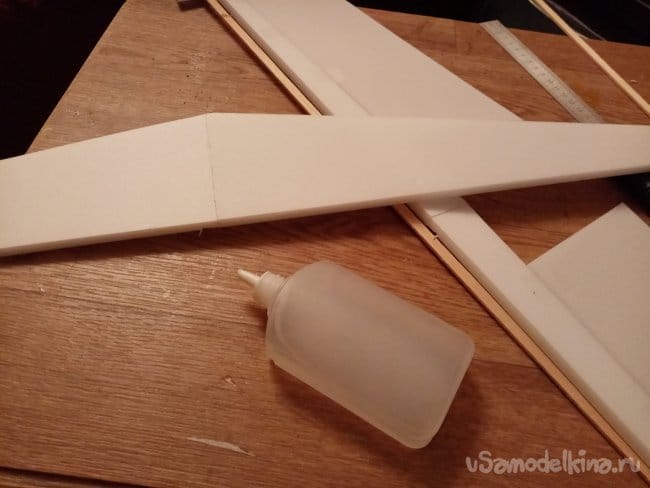 Теперь нужно монтировать крыло, по шаблону наношу разметку. Клей тонкими линиями на заготовки и соединяю. Проверяю точность установки.