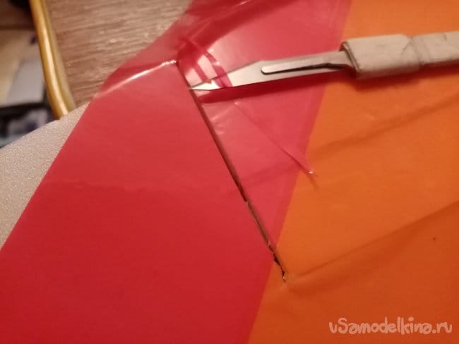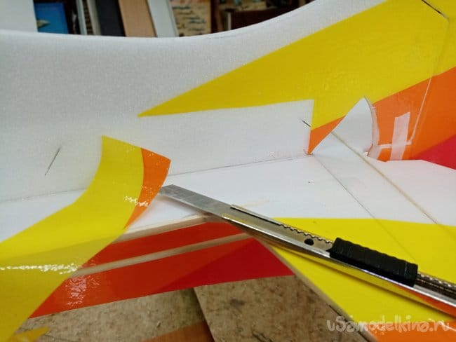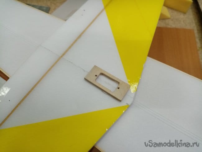 Размечаю место крепления сервоприводов на нижней части фюзеляжа, приклеиваю рамки и прорезаю отверстия насквозь, где нужно срезаю скотч. Поскольку к нему клей не прилипает.