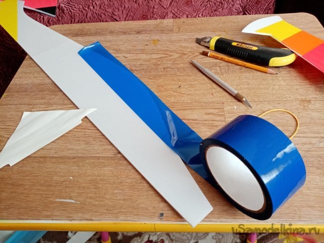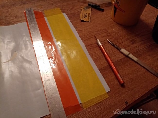 На хвостик такой широкий скотч не пойдет, наклеиваю на подложку от рекламной пленки разные цвета, разрезаю на более узкие полоски и переношу на нужное место.