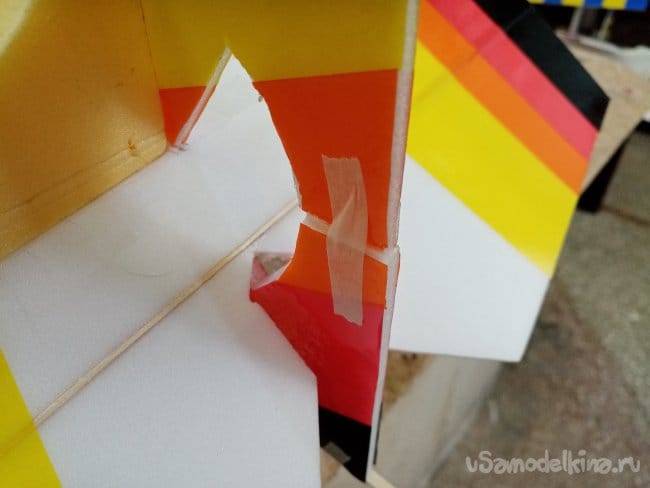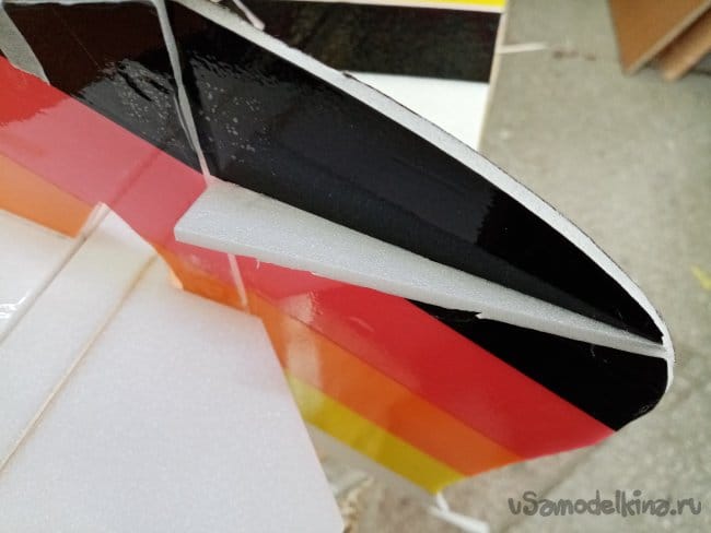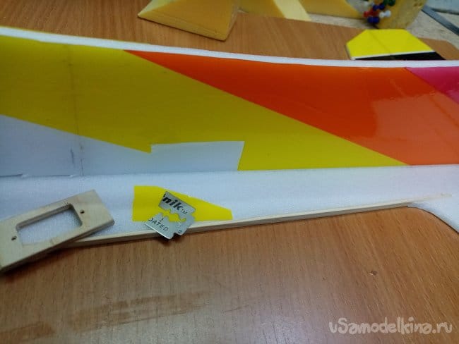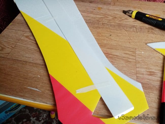 Затем отрезаю под сорок пять градусов ребро навески элеронов и устанавливаю на крыло, фиксируя скотчем с двух сторон.
