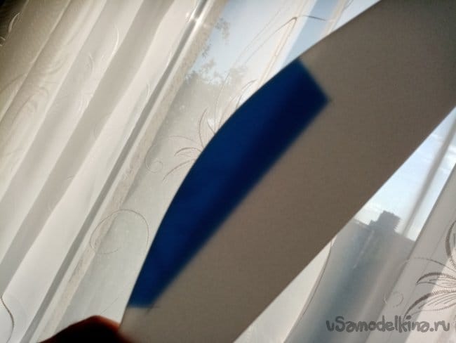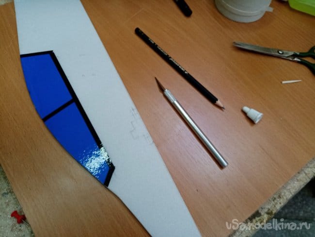 Чтобы попасть точно в кабинку с обратной стороны, подношу фюзеляж к окну и размечаю границы фонаря на просвет.На подложке разрезаю черный скотч на полоски, делаю переплет фонаря.