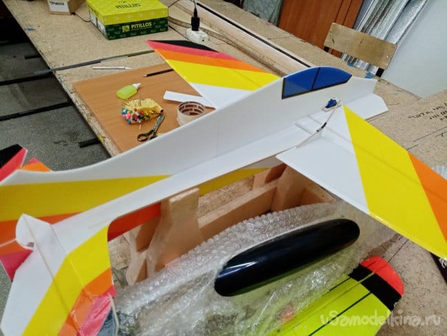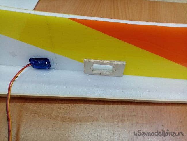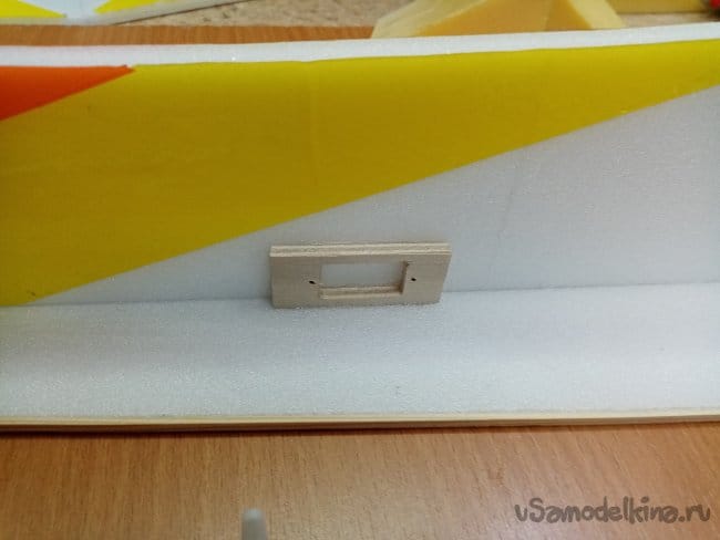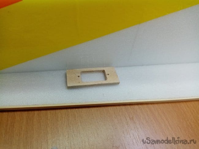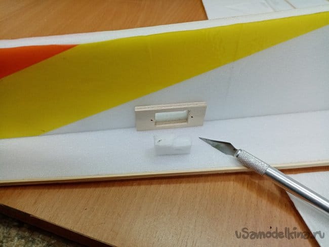Снимаю все фиксирующие треугольники с нижней части фюзеляжа и извлекаю иголки. Теперь конструкцию можно устанавливать на стапель. Буду работать с верхней частью. Приклеиваю рамку для сервопривода элеронов и врезаю отверстие для его установки в крыле.