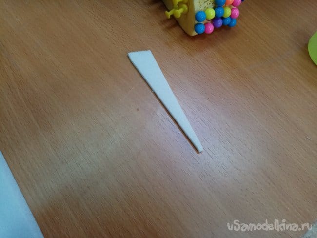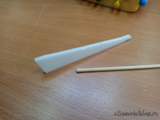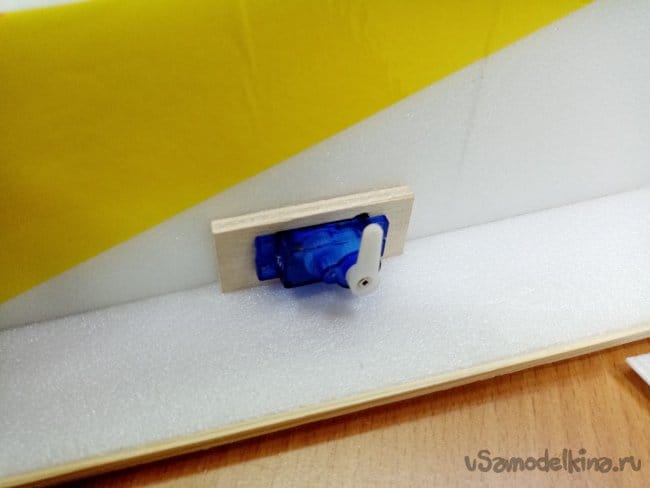 Конец тяги приклеиваю на пенопластовый треугольник, причем высота его должна равняться длине плеча качалки на сервоприводе. Тогда передача будет один к одному. При отклонении качалки на сорок пять градусов, элерон тоже отклонится на сорок пять градусов.