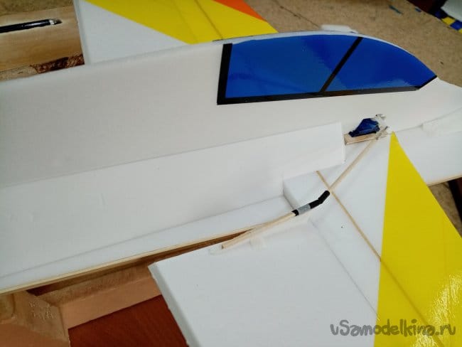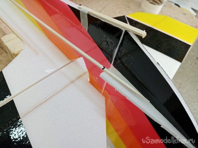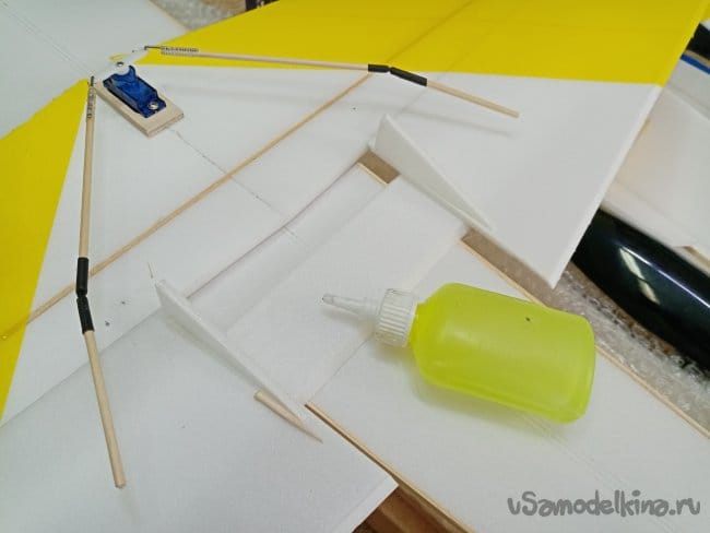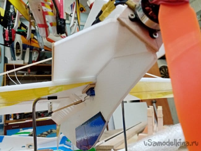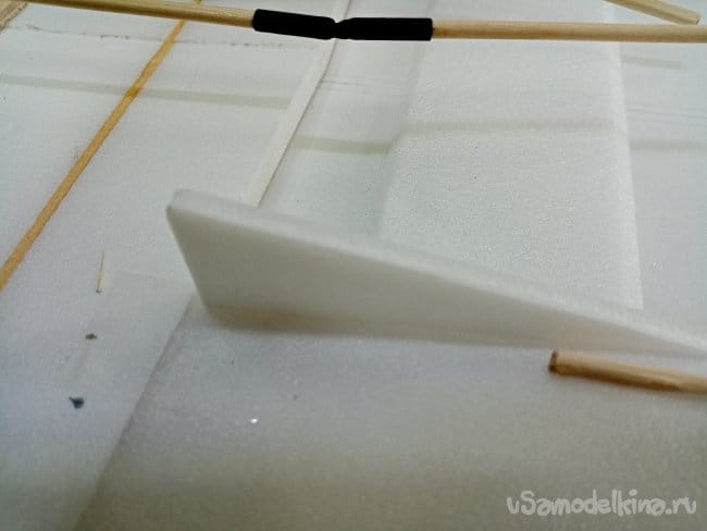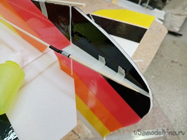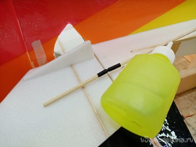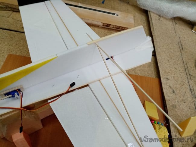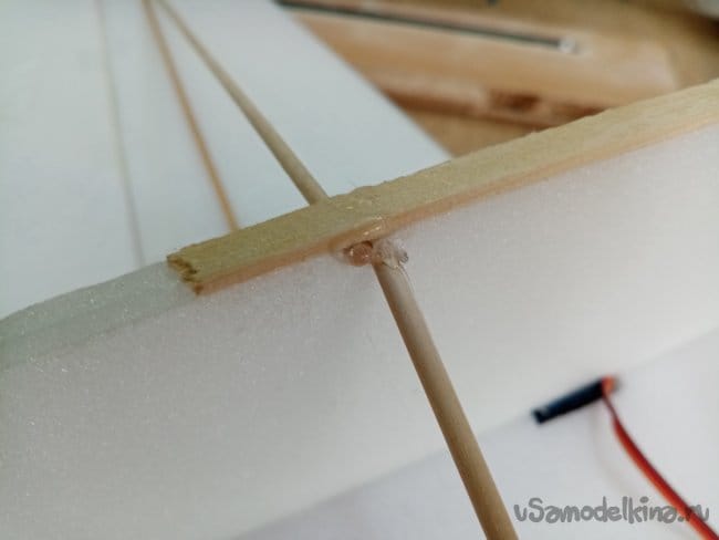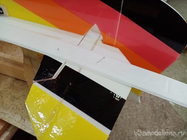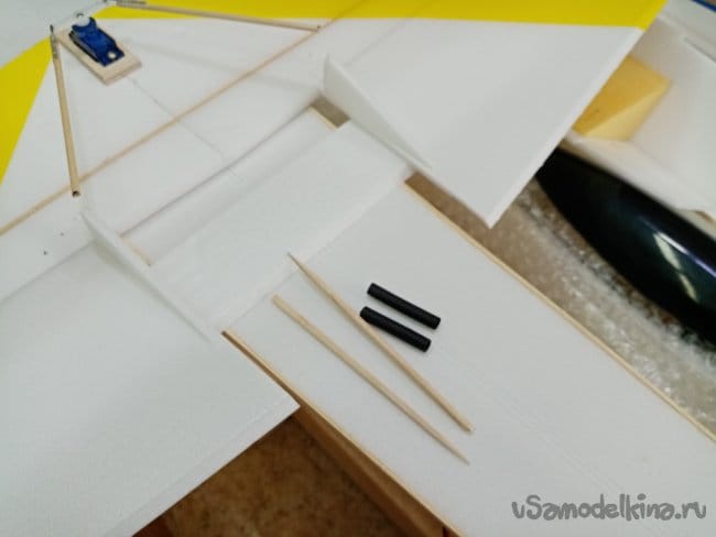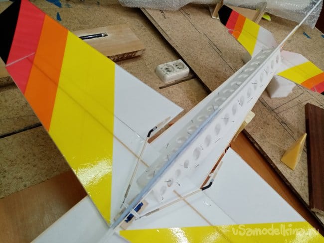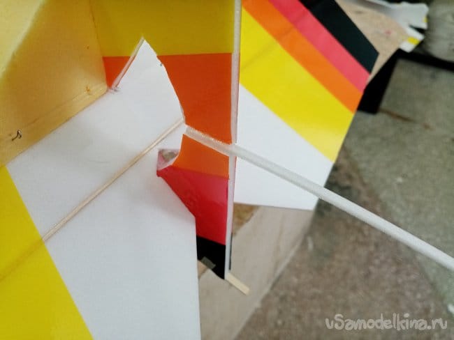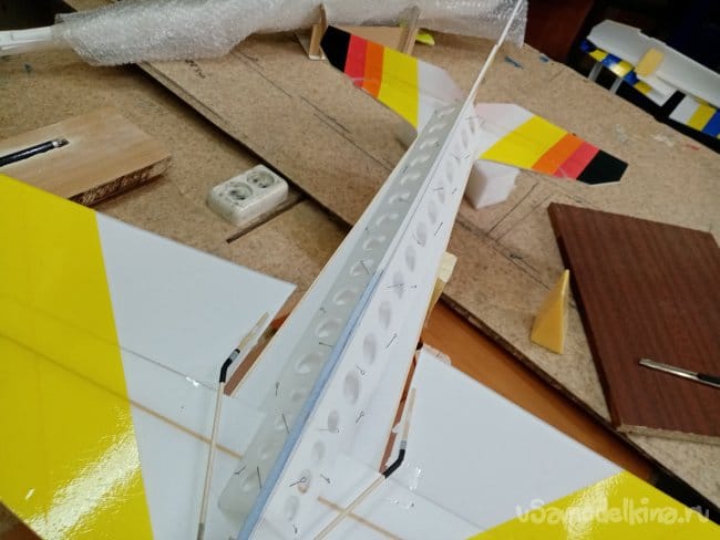 Крылья и все рулевые поверхности тоже укрепляю растяжками с двух сторон, для жескости.