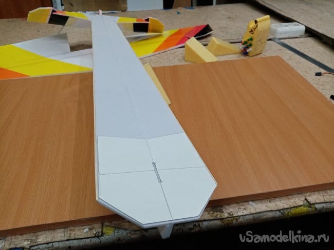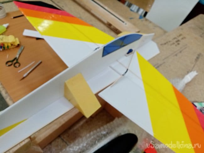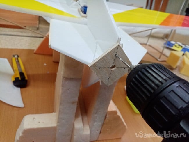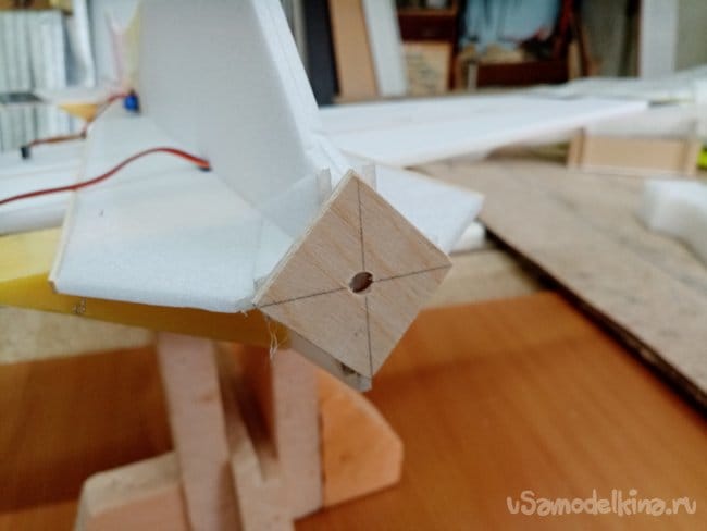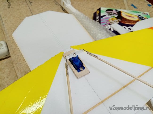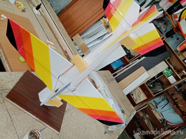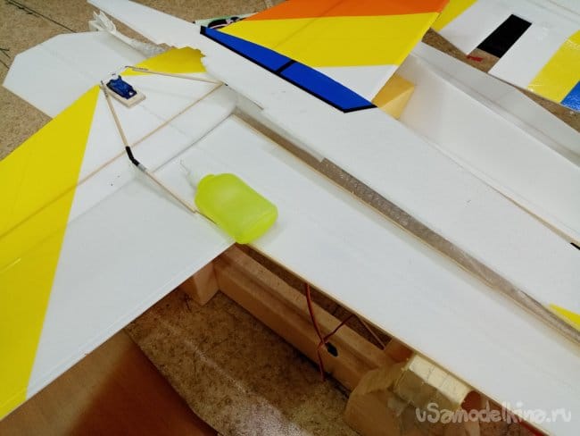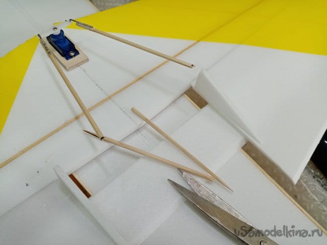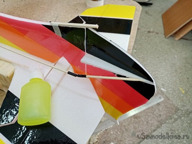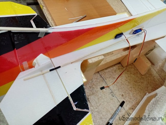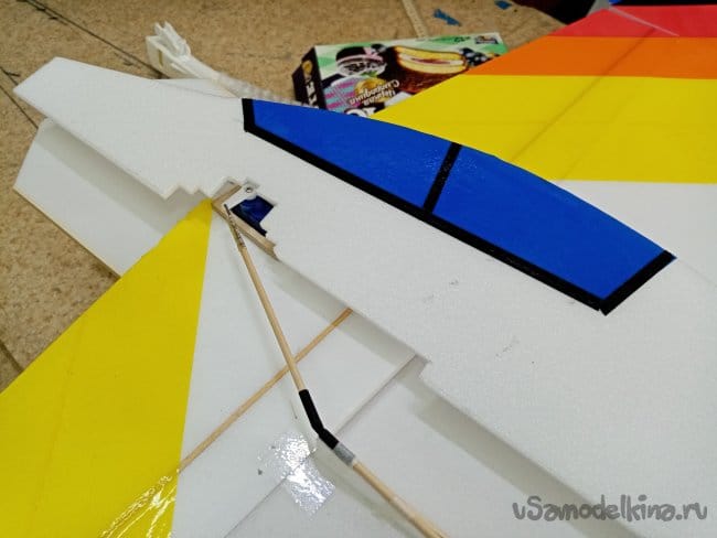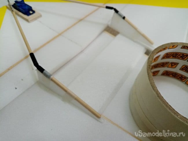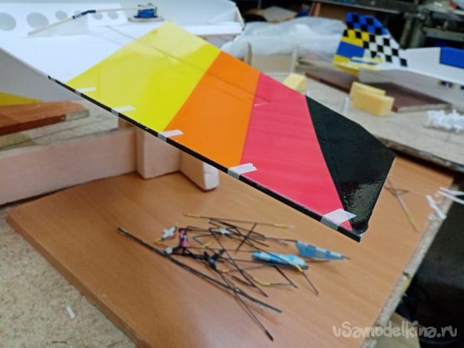Крылья и все рулевые поверхности тоже укрепляю растяжками с двух сторон, для жескости.