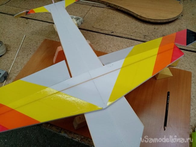 Поскольку у меня вариант для улицы, конструктивно крылья будут накладываться на горизонтальную часть фюзеляжа. так прочнее.