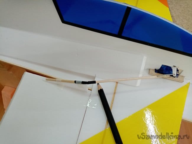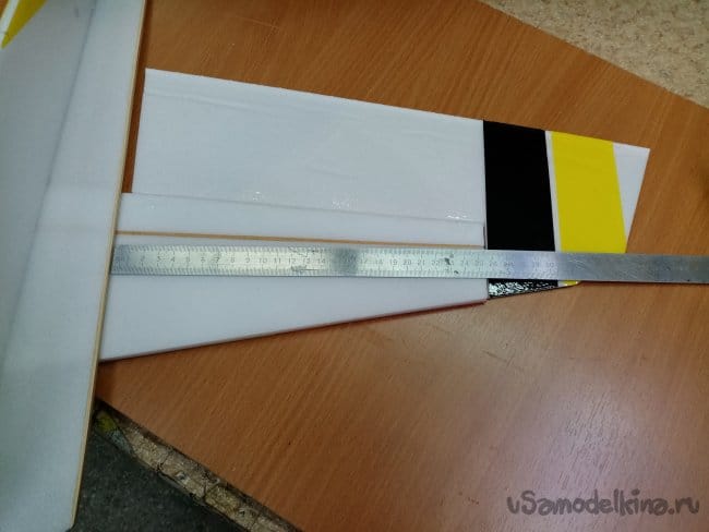 На горизонтальной плоскости фюзеляжа размечаю место приклейки верхней и нижней вертикальной пластины. Вверху четыре миллиметра, внизу восемь миллиметров полоски, мягким карандашом 8В.