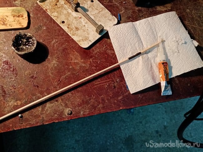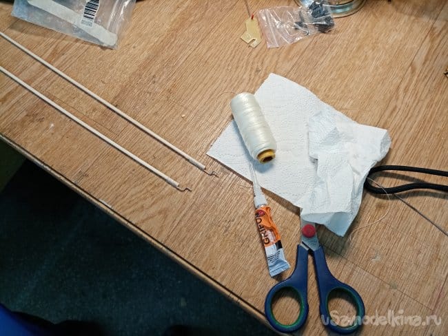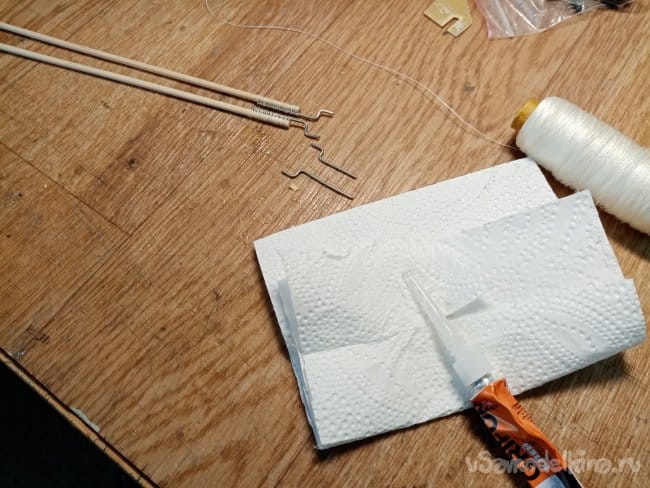 Пока заклеивается, перехожу к изготовлению тяг на рудер, элеватор. По схеме проволока, нитки, циакрин.