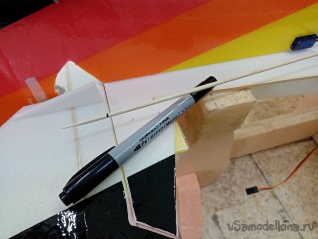 Затем отмечаю длину тяги, перелом должен находиться точно на линии перегиба элерона, затем отрезаю ножницами.