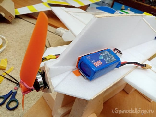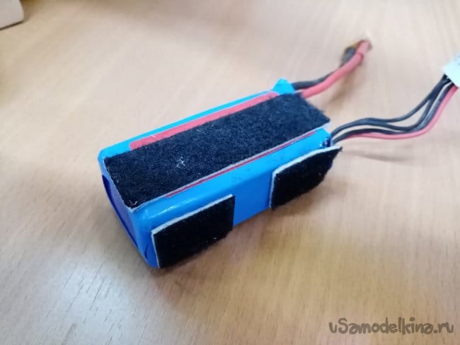Легкие аккумуляторы к сожалению все передохли, посылка из Китая еще в пути. Поэтому устанавливаю тяжеленный на тысячу пятьсот миллиампер. Как правило на таких легких паркфлаерах использую триста пятьдесят или пятьсот миллиампер часов.