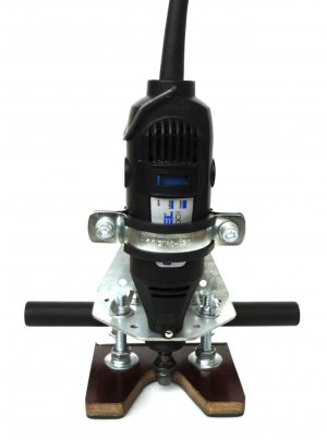 Конструкция получилась достаточно компактная при хорошей устойчивости. Рукоятка вполне удобная. Пластик подошвы плавно скользит по разным материалам. При необходимости вместо прижимной планки (или под нее) есть возможность установить рейку циркуля для работы с окружностями. Благодаря приличному количеству готовых крепежных мест нет проблем с креплением дополнительных конструктивных элементов, которые могут понадобятся при дальнейшей эксплуатации устройства.