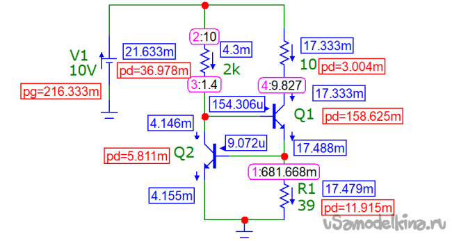 R1 = Uмин-UbeT1-UbeT2/Ib = (5,0-0,70-0,70)/0,85 мА = 4,23 кОм