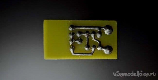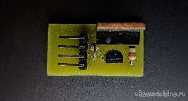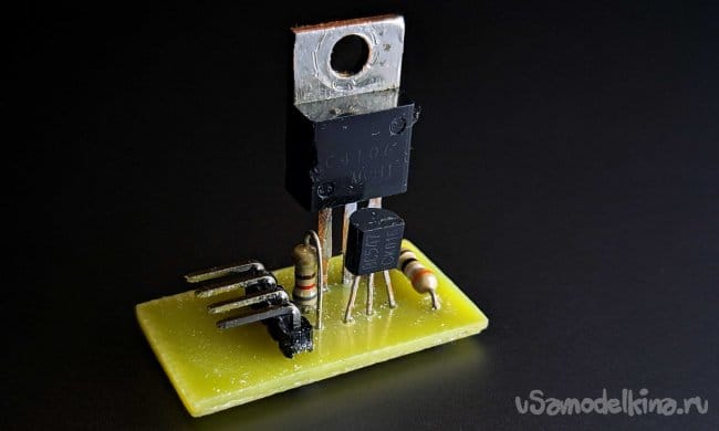 Платка получилась миниатюрной, разъёмы подключения угловые штыри, компоненты дискретные. Для маломощной нагрузки (как в примере) такой мощный транзистор T1 может быть избыточен, но при большем токе стабилизации он как раз пригодится, так как легко прикручивается на рассеиватель тепла.