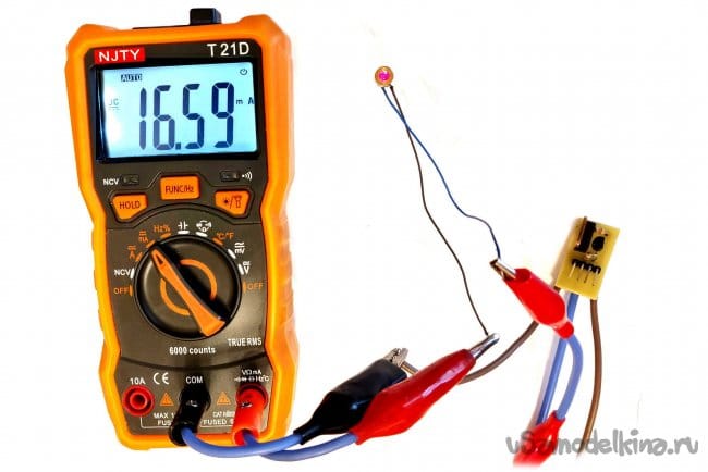 Для такого лазера (650 нм 5 мВт) номинальный ток до 40 мА. Выходное напряжение составило 2,07 В, то есть потребляемая мощность 35 мВт.