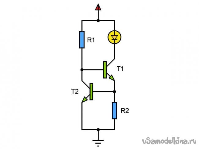 Для светоизлучающих диодов и лазеров важно значение тока, протекающего через них. Когда кристалл нагревается, то уменьшается сопротивление и как следствие при неизменном напряжении питания увеличится ток, если он будет более заявленного производителем, то прибор будет еще больше нагреваться и вскоре после непродолжительной работы может деградировать или вовсе выйти из строя, таким образом один из плюсов этих приборов: большая продолжительности жизни аннулируется. Чтобы этого не произошло мы сделаем устройство, следящее за значением тока и предотвращающее его изменение, даже при уменьшении сопротивления нагрузки.