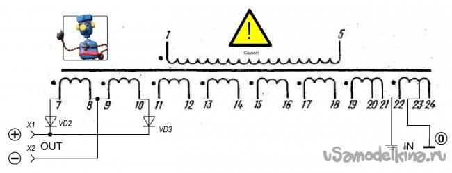 Трансформатор на фото явно защищен от внешних воздействий получше, чем трансформатор в ролике. Т.к. обмоток у ТАН-41 побольше, схема выглядит так.