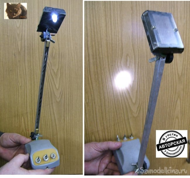 И еще удачная конструкция тех времен – светильник типа настольной лампы, СБ калькуляторная, аккумуляторы-таблетки, два светодиода. Сколько ему лет – много, можно судить по корпусу основания.