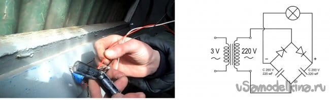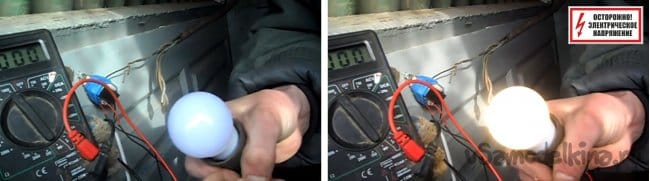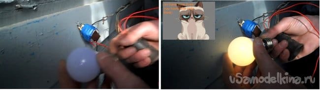 Для проверки нагрузочной способности Авт подключает светодиодную лампочку 220 V, 3 W, делает это с риском для жизни, но лампочка загорается. Ура! Но яркости маловато.
