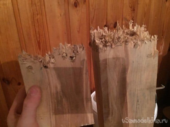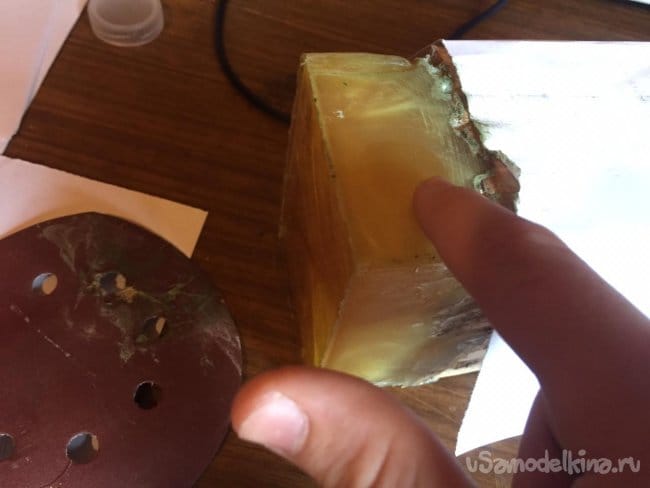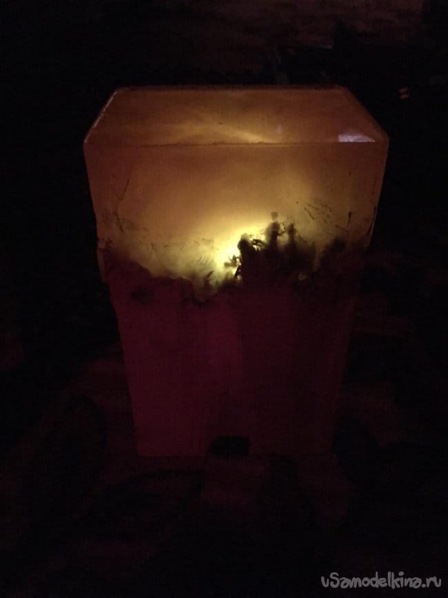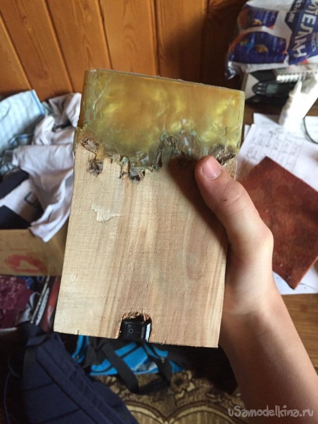 После я снял опалубку и обнаружил, что отверстие, где находились батарейка и выключатель залито затвердевшей смолой на три сантиметра. Я решил возникшую проблему при помощи электолобзика, отпилив два сантиметра с нижней части светильника. Мне пришлось распилить батарейку и выключатель и заменить их на новые.
