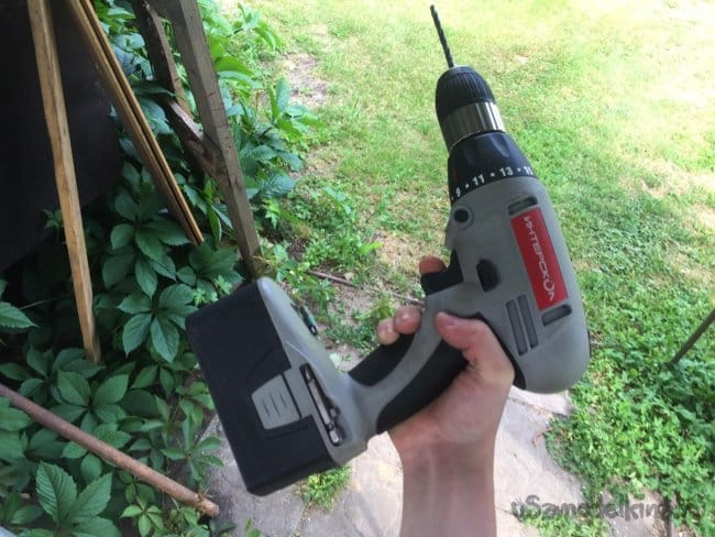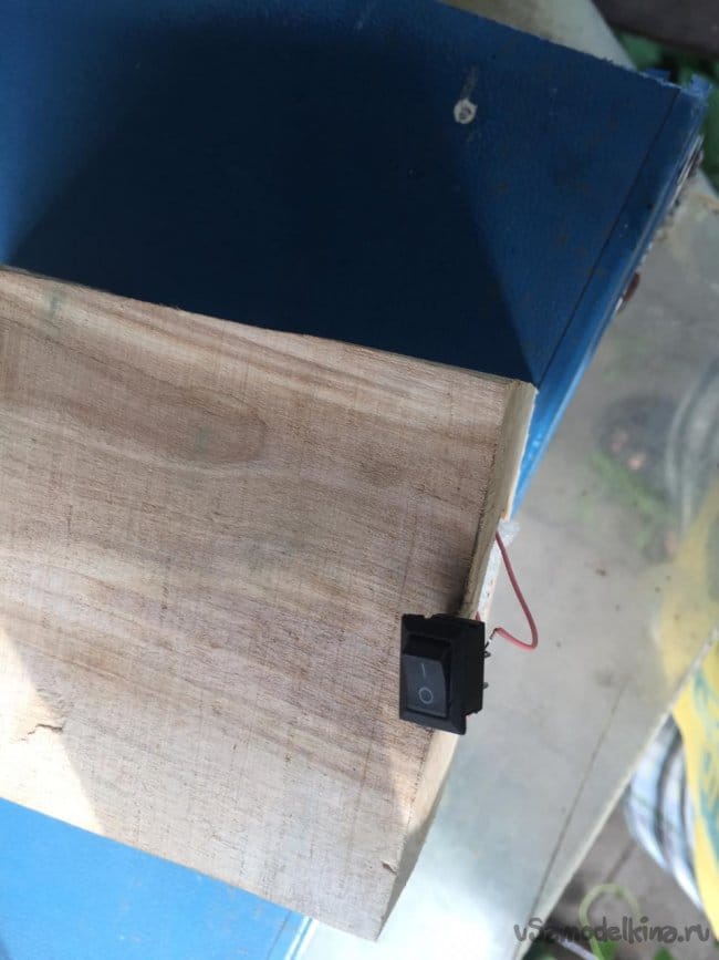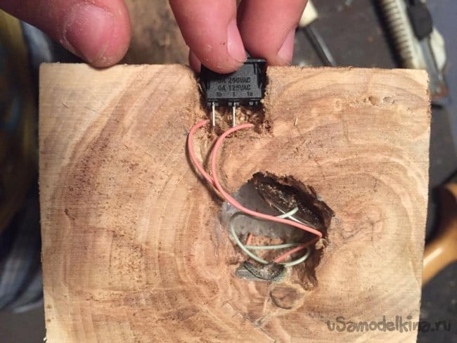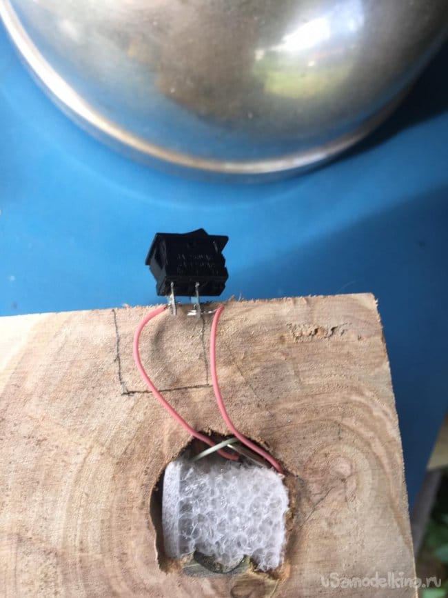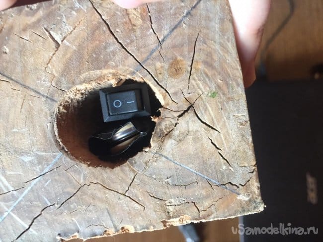 Для того чтобы приклеить выключатель, я при помощи шуруповёрта и сверла проделал место для переключателя.