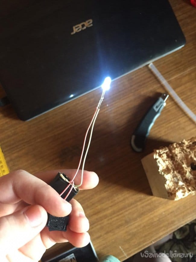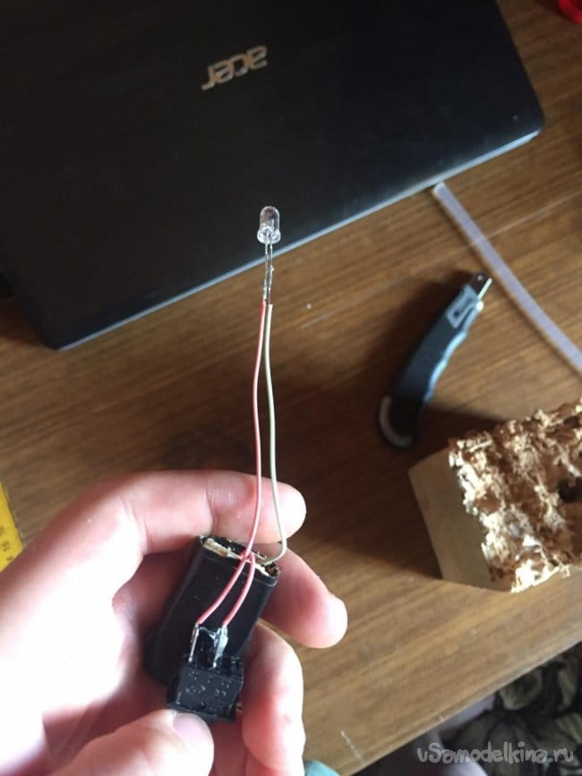 Спаяв из 3В-го светодиода, двухпозиционного переключателя и 3В-ой батарейки электронную "начинку" будущего светильника.