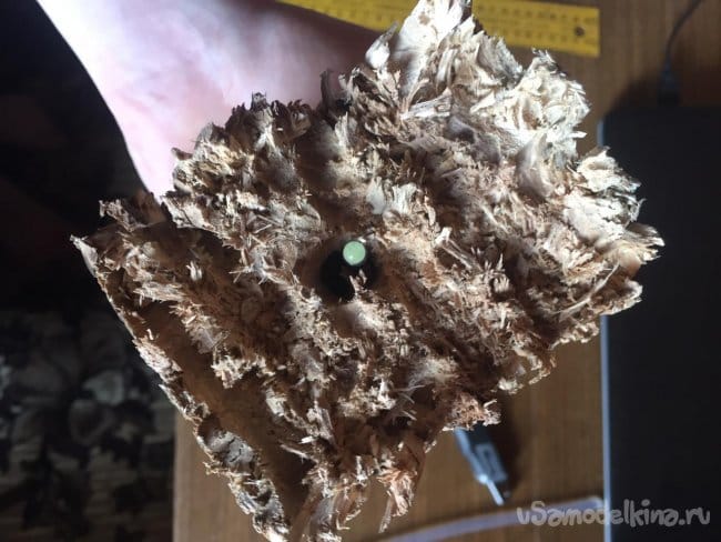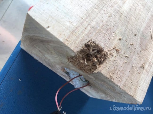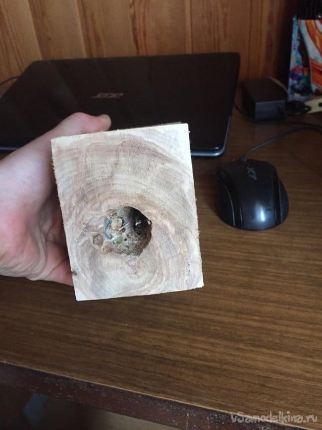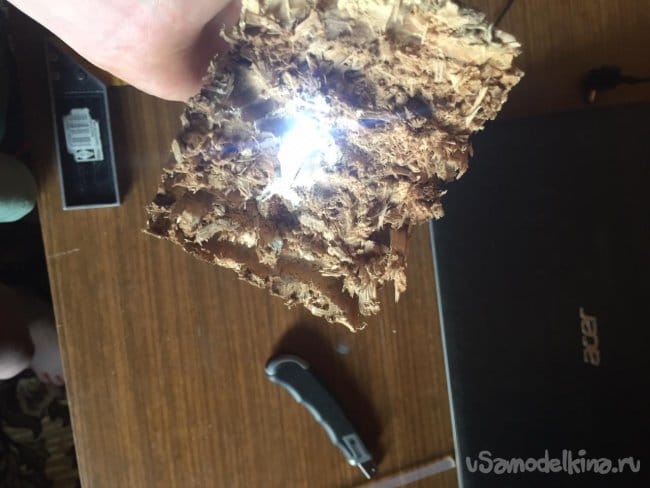 Далее я приклеил источник света в центр деревянной заготовки на термоклей.