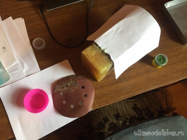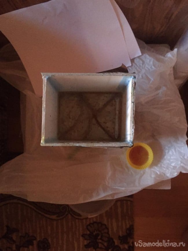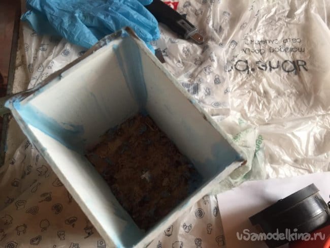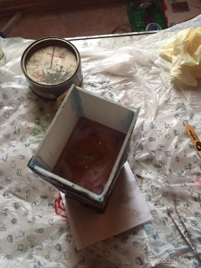 Намазав внутреннюю поверхность опалубки разделителем для того, чтобы при полном застывании смолы без особых усилий снять опалубку со светильника.