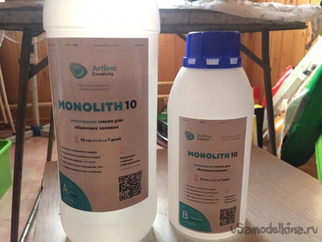 Я использовал смолу для столешниц, так как толщина заливки у неё больше, чем у смолы для ювелирных изделий.
