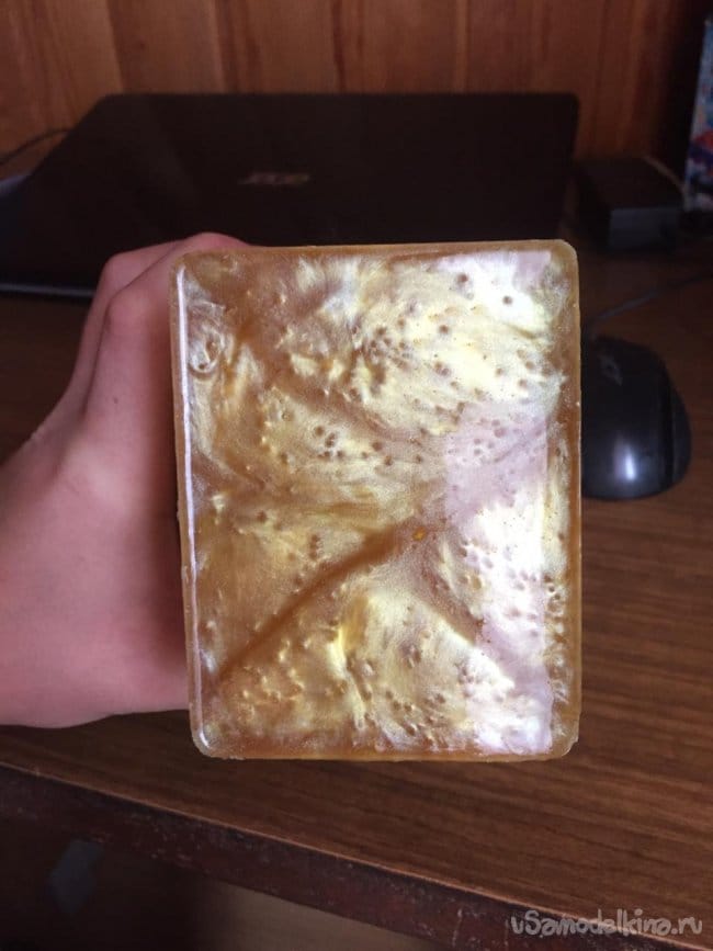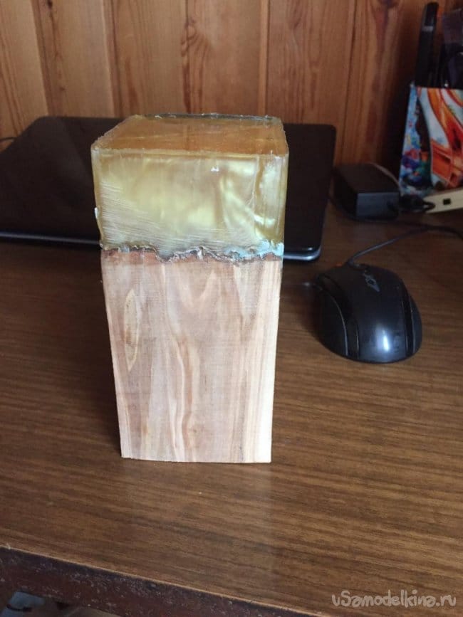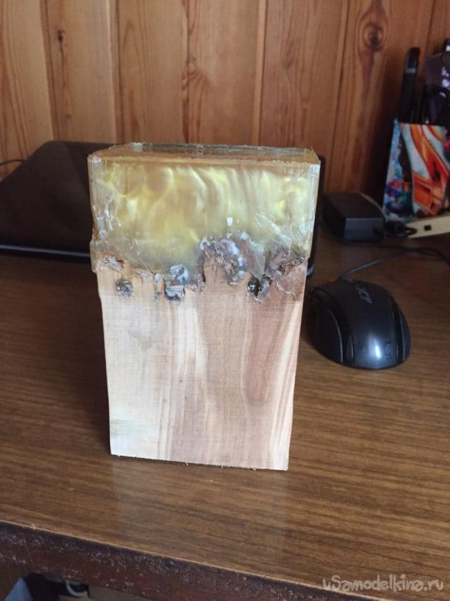 Теперь о трудностях: при герметизации опалубки я допустил ошибку. Так как у смолы плотность немного больше, чем у воды, опалубка стала протекать в следствии плохой герметизации. Чтобы выйти из сложившейся ситуации, я принял решение вылить смолу в другую емкость, а оставшаяся её часть решила проблему плохой герметизации. На следующий день я вернул вылитую смолу обратно в опалубку. При этом цвет смолы изменился.
