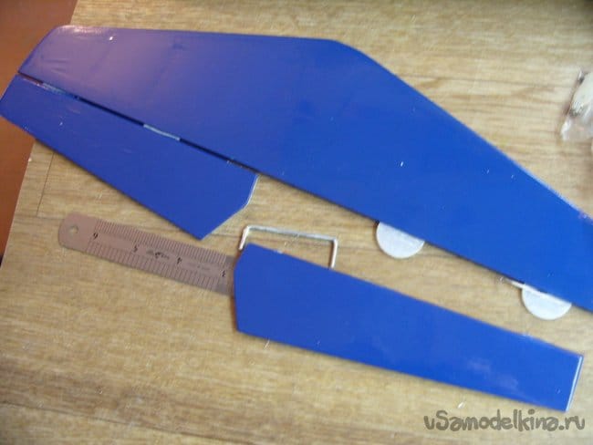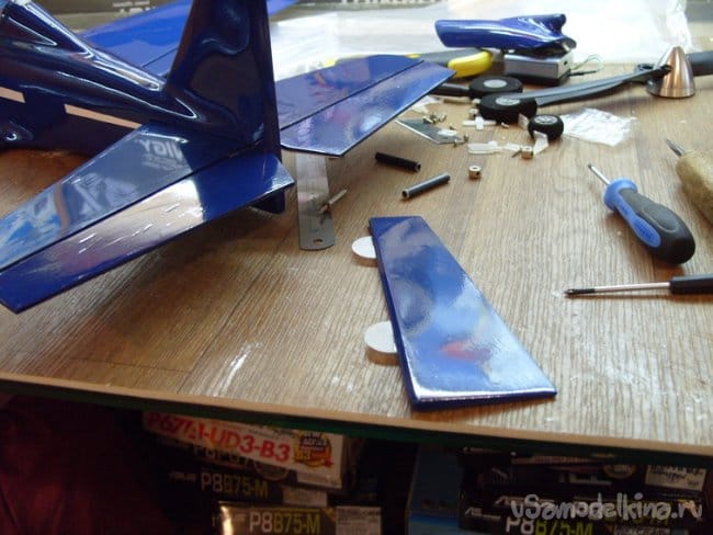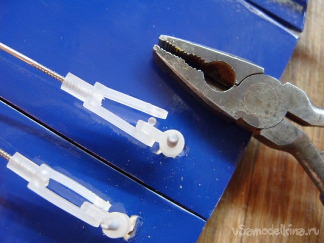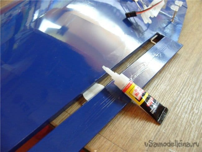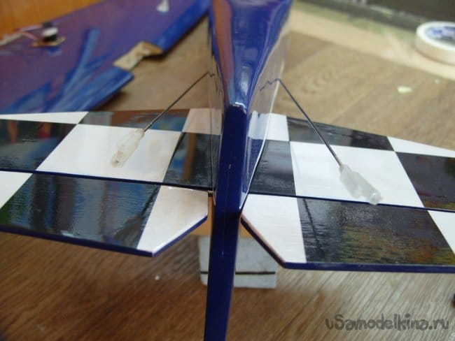 Затем навешиваю элероны, на пластиковые петри, места для петель уже прорезаны, постов вставляю и фиксирую циакрином. Здесь все ровно и четко.