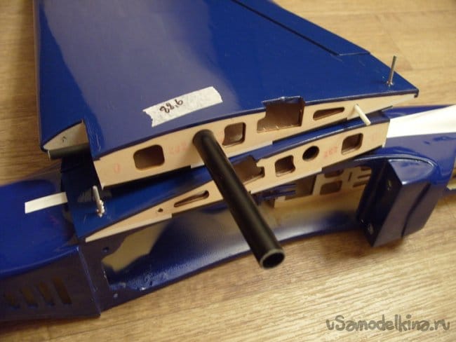 Крылья соединяются на довольно прочной карбоновой трубе и маленьких штырях. Соединение будет неразъемное поскольку в средней части будет установлен сервопривод, один на два элерона.